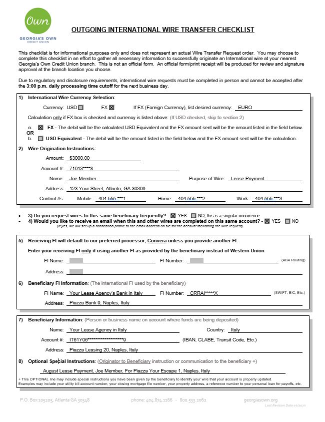 Visit your nearest branch to get started. Complete the Outgoing International Wire Transfer Checklist to make sure you have everything you need.2
